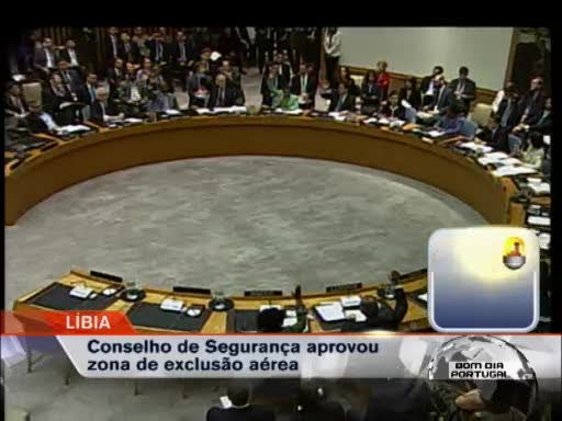 O Conselho de Segurança da Organização das Nações Unidas (ONU) aprovou a zona de exclusão aérea na Líbia. Foram aprovadas também “todas as medidas necessárias” – também incluída a ação militar - para proteger os civis e impor o cessar-fogo às forças de Kadhafi. Na cidade de Benghazi, o bastião dos rebeldes no leste do país, as deliberações da ONU foram celebradas com tiros para o ar e foguetes.