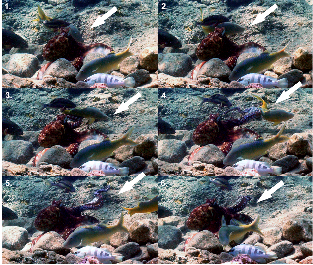 Sequencia fotográfica da ação do polvo. Foto: autores do estudo/DR