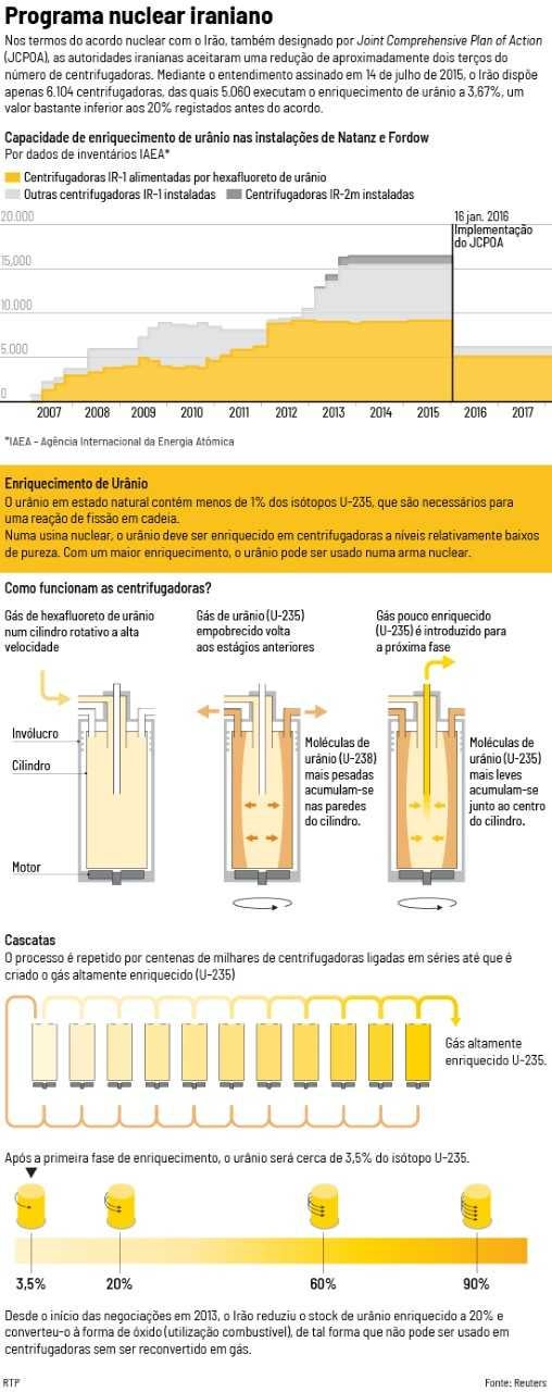 O Irão está pronto para reiniciar o programa nuclear numa “escala industrial", depois de Donald Trump, Presidente dos EUA, ter anunciado que abandonava o acordo que restringe as ambições nucleares iranianas. O anúncio surge na véspera da partida do ministro dos Negócios Estrangeiros, Mohammad Javad Zarif, a Pequim, Moscovo e Bruxelas, numa ronda diplomática.
