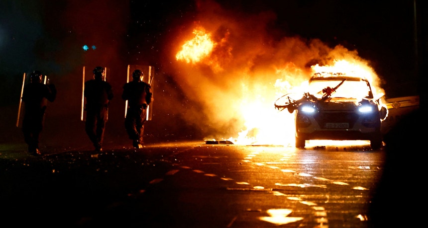 destruídas e fogos de artíficio a ecoarem pela cidade. "Uma fação de hooligans loucos movidos por uma ideologia de extrema-direita", declarou o comissário da polícia Drew Harris.