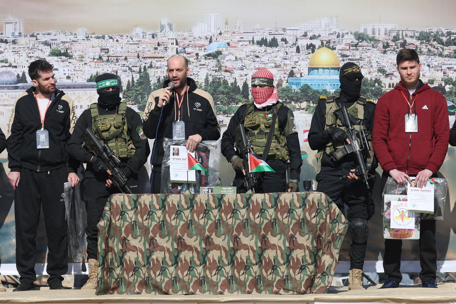 Desde a entrada em vigor do cessar-fogo, em 19 de janeiro, esta é a sexta troca de reféns por prisioneiros. Até à data, foram libertados 16 reféns israelitas ou com dupla nacionalidade, bem como cinco reféns tailandeses libertados à margem do acordo. Como em todas as libertações de reféns, centenas de combatentes do Hamas, encapuzados e armados, formaram um cordão à volta de um pódio, desta vez em Khan Younis, no sul do território palestiniano devastado por 15 meses de guerra.