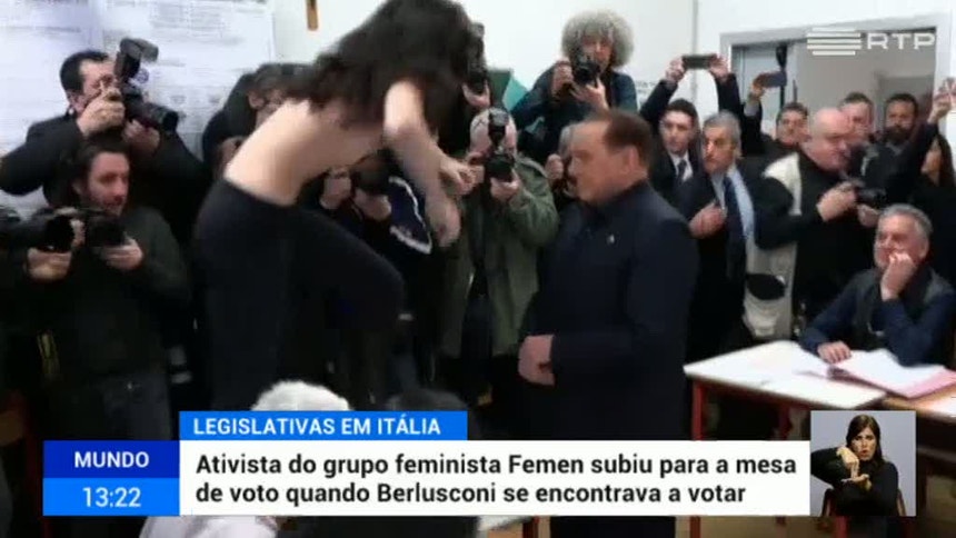 A votação deste domingo fica desde já marcada por um curioso protesto contra Sílvio Berlusconi. Uma ativista mostrou os seios e subiu para cima da mesa de voto quando o ex-primeiro-ministro italiano se preparava para votar.