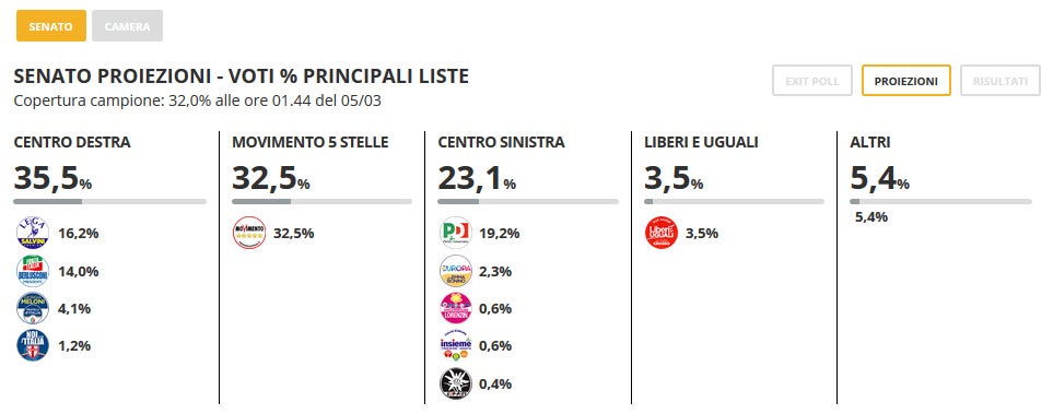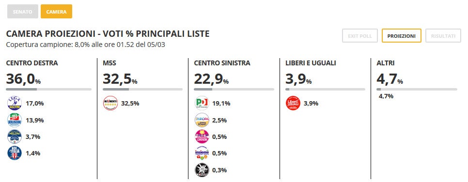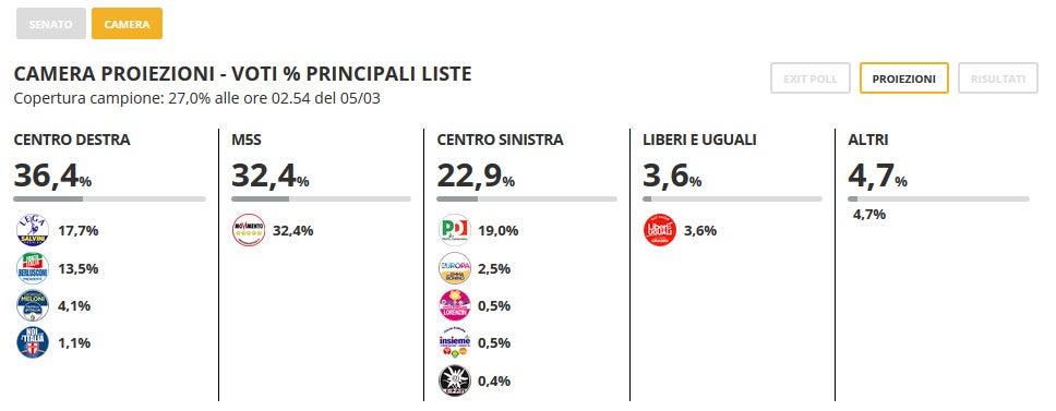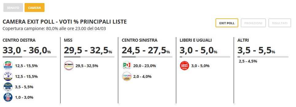 Os valores revelados pelos meios de comunicação italianos vão ao encontro das sondagens reveladas antes do arranque da campanha eleitoral. O Movimento Cinco Estrelas surge em primeiro lugar mas, quando coligado, o centro-direita tem mais votos. Nenhum dos blocos deverá ter maioria absoluta.