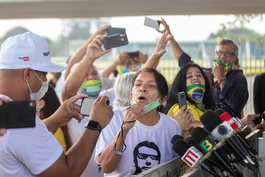 Todos os dias, apoiantes de Bolsonaro ficam ao lado dos jornalistas, em frente ao Palácio da Alvorada, onde o Presidente brasileiro cumprimenta frequentemente os militantes e presta declarações à imprensa.