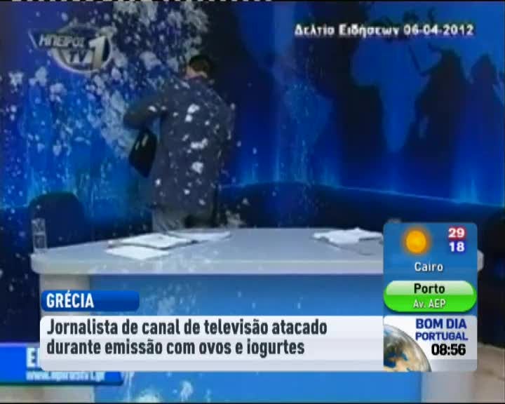 Na Grécia o jornalista de um canal regional de televisão foi interrompido em direto, no estúdio, por manifestantes que o atacaram com ovos e iogurtes.
