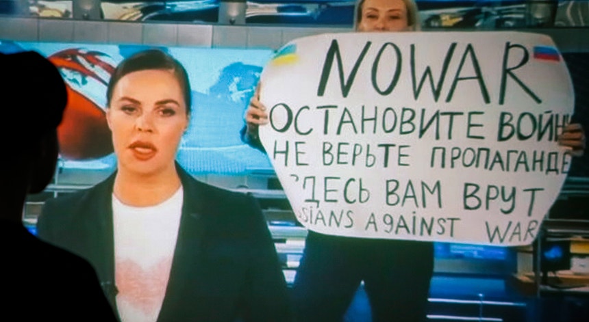 Uma jornalista russa protestou contra guerra em direto na televisão estatal ao exibir um cartaz, em estúdio, no momento em que o jornal era apresentado. O protesto foi visível durante alguns segundos, Marina Ovsyannikova foi depois detida.