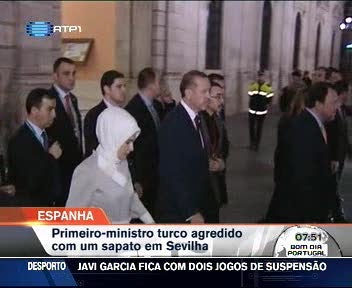 O primeiro-ministro da Turquia foi alvo de uma tentativa de agressão em Espanha com um sapato. O incidente ocorreu depois de uma cerimónia em Sevilha. O agressor foi identificado como um jovem sírio que gritou "viva o Curdistão".