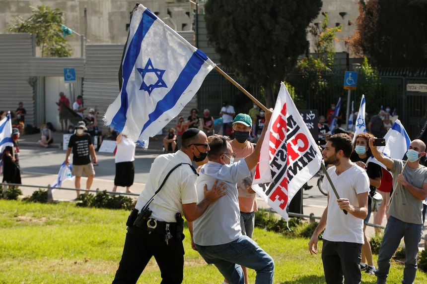 Os protestos contra o primeiro-ministro de Israel, acusado de várias fraudes e de corrupção, têm-se sucedido semanalmente, com os manifestantes a exigirem a sua demissão devido à forma como tem gerido a pandemia de Covid.19. Muitos têm viajado de outras cidades para integrar os protestos.