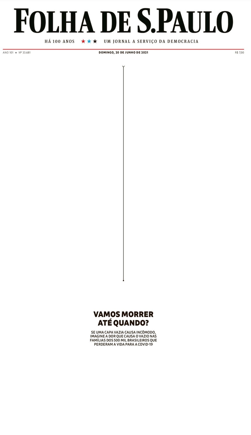 Vários leitores classificaram como "arrepiante" a capa em branco da edição de domingo do jornal brasileiro Folha de S.Paulo, que visava assinalar as 500 mil vidas perdidas devido à covid-19 no país sul-americano.