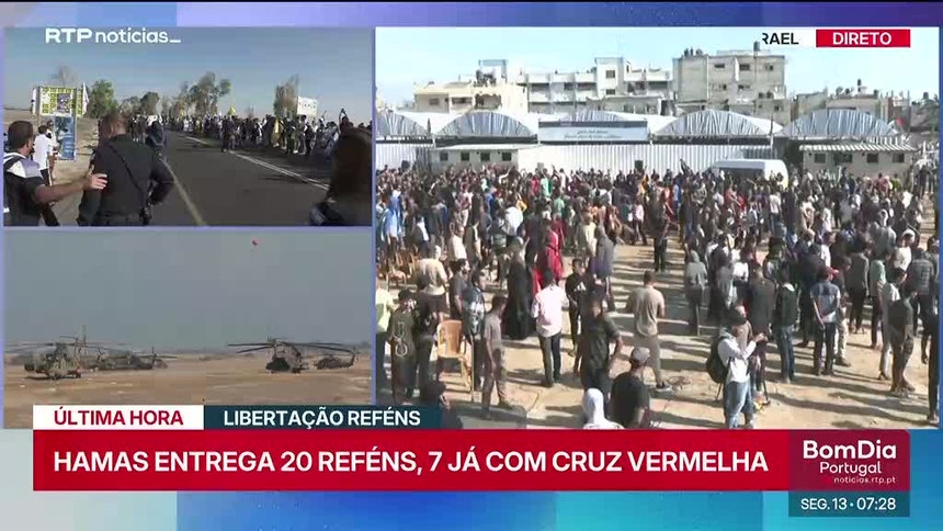 O Hamas libertou hoje todos os 20 reféns vivos mantidos em Gaza, sendo que sete dos reféns foram libertados ao início da manhã, enquanto os restantes 13 foram libertados algumas horas depois.