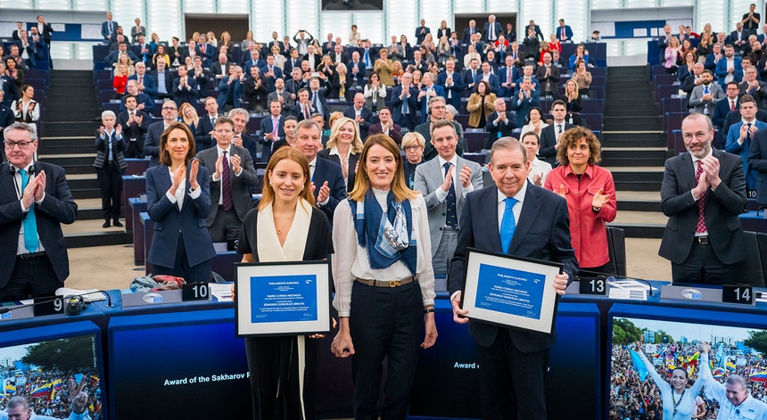 Edmundo González está exilado e Maria Corina Machado na clandestinidade desde as eleições de 28 de julho. O homem que reivindica o título de presidente da Venezuela esteve em Estrasburgo. Maria Corina Machado participou na cerimónia à distância.