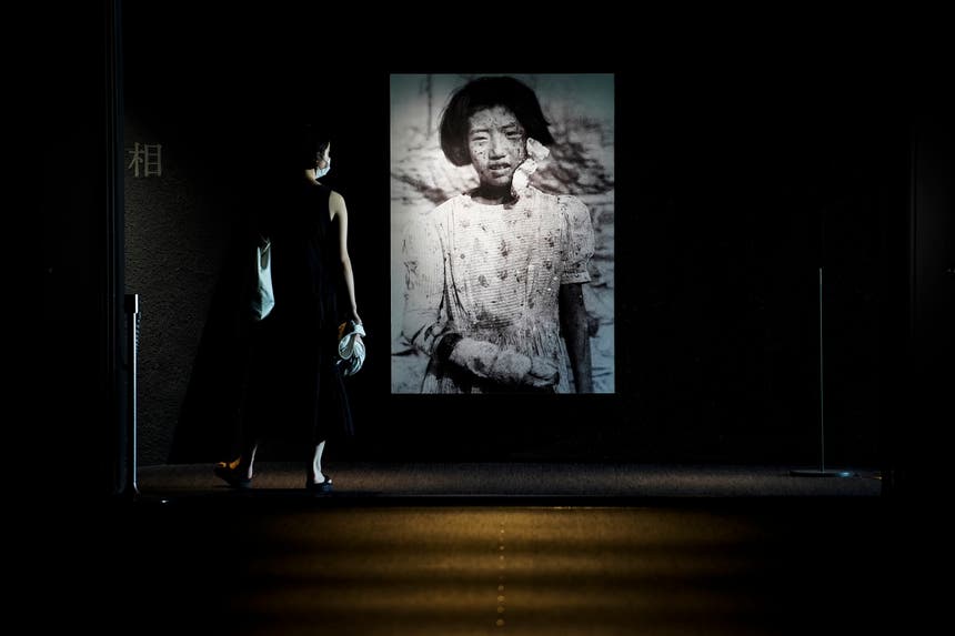 Foto: EPA (visitante observa imagem de sobrevivente, no Museu do Memorial da Paz de Hiroshima)