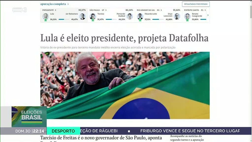 Segundo as projeções da empresa independente Datafolha, Lula da Silva foi eleito pela terceira vez Presidente do Brasil. Já estão apuradas mais de 90% dos votos.