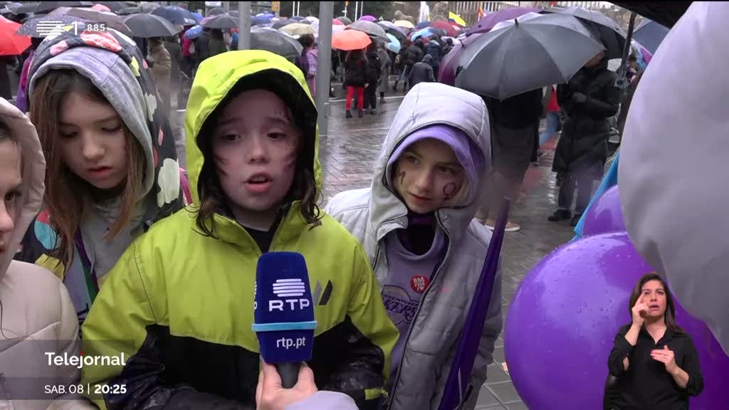 Apesar do forte temporal, dezenas de milhares de pessoas percorreram as ruas de Madrid em defesa dos direitos já conquistados e contra a onda reaccionária e machista que varre alguns governos na Europa e no mundo.