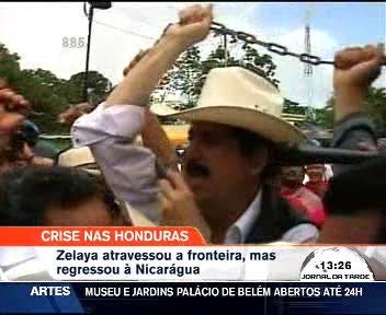Zelaya acompanhado por uma multidão de jornalistas e de partidários entrou a pé em território das Honduras às 14h25 locais (20h25 GMT) antes de regressar à Nicarágua onde passou a noite na localidade de Ocotal.