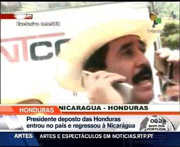 O presidente deposto, Manuel Zelaya, entrou por momentos no solo hondurenho na passada sexta-feira, pela primeira vez desde o seu derrube à força em 28 de Junho. Recebido em apoteose regressou à Nicarágua, poucos minutos depois.