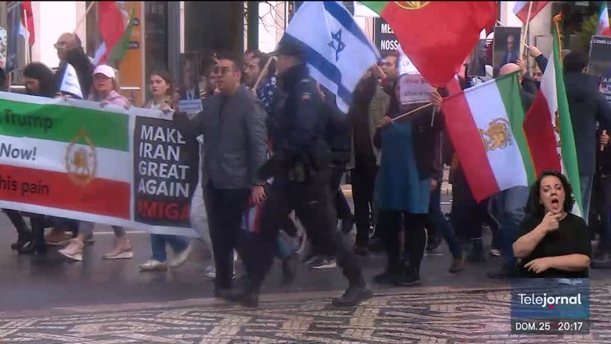 Os manifestantes empunhavam bandeiras do Irão, de Portugal, Israel e Estados Unidos, bem como cartazes com o rosto do príncipe herdeiro Reza Pahlavi, filho do xá deposto em 1979 pela Revolução Iraniana, e do Presidente dos Estados Unidos, Donald Trump.