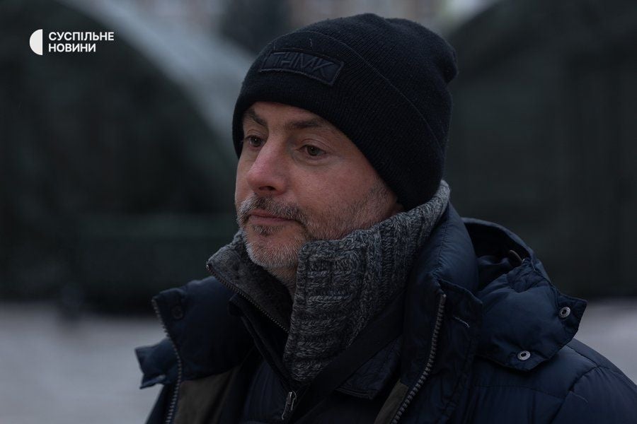 Maksym Bakhmatov, chefe da administração estatal do distrito de Desnianskyi, fala aos jornalistas perto de um ponto de aquecimento num dos pátios de Troieshchyna. Kiev, 27 de janeiro de 2026.