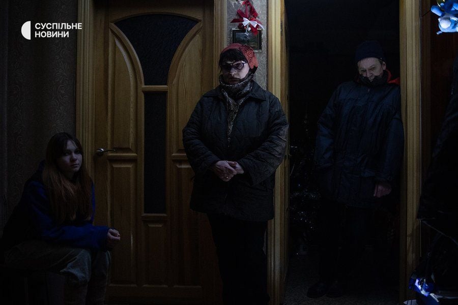 Liza, Liudmyla e Volodymyr no seu apartamento sem eletricidade nem aquecimento, num edifício da Avenida Chervonoi Kalyny, em Troieshchyna. Kiev, 27 de janeiro de 2026.