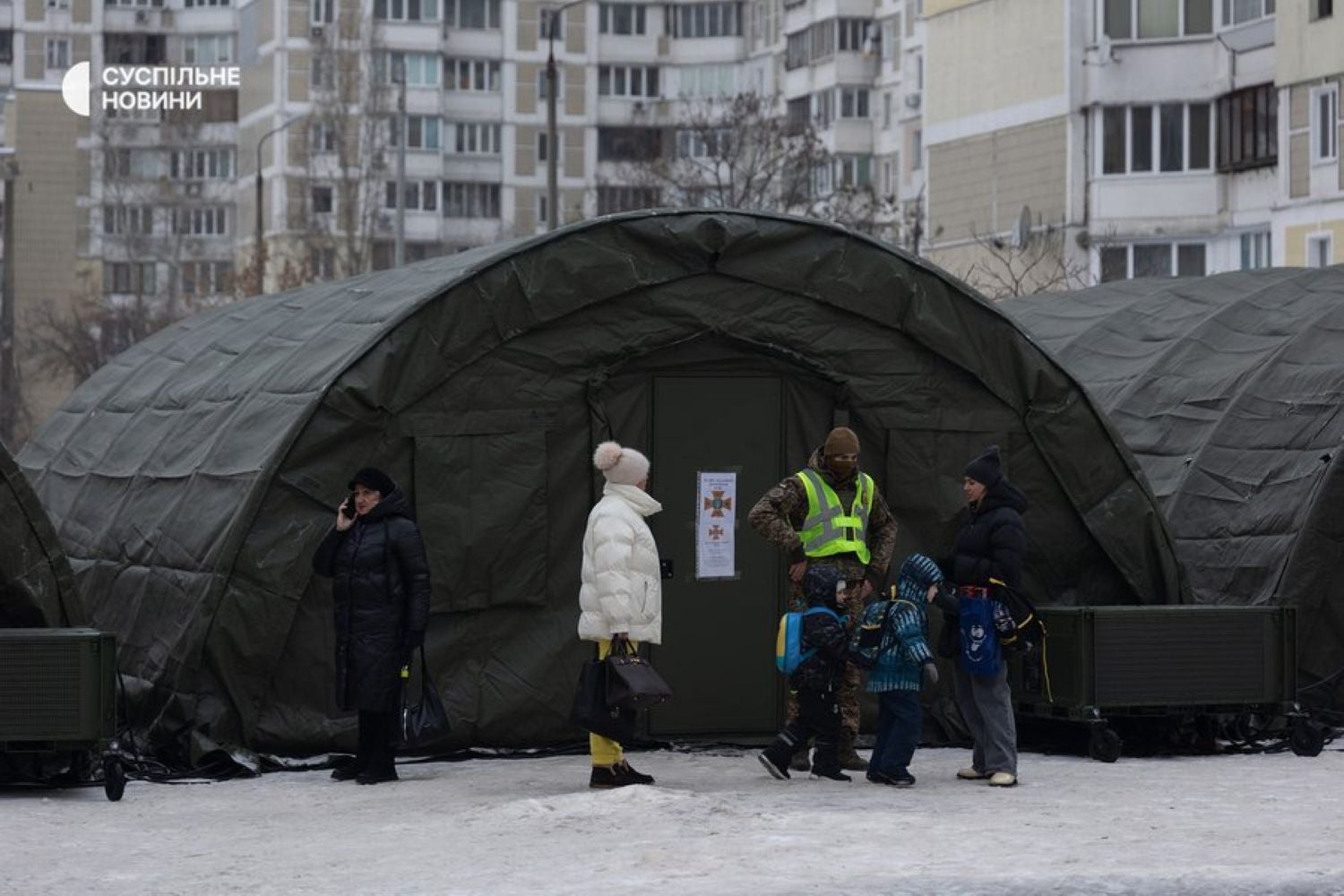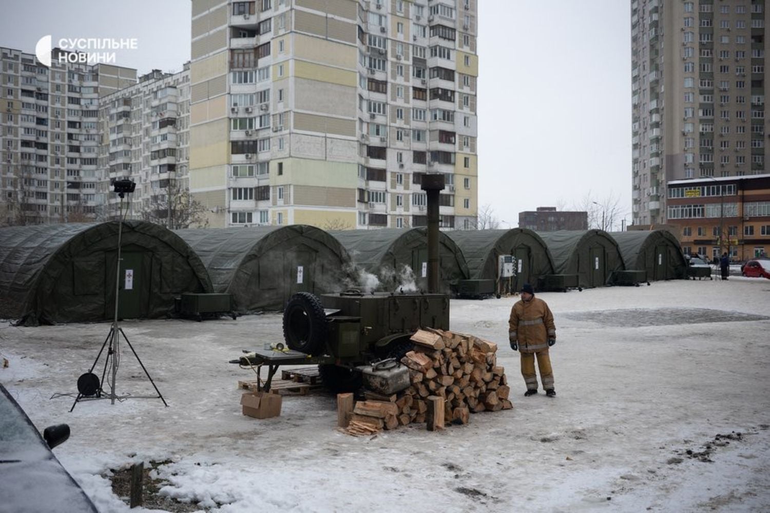 As tendas foram colocadas entre edifícios altos para que as pessoas se pudessem aquecer e carregar os seus aparelhos. Esta parte da capital ficou sem aquecimento depois de a central térmica n.º 6 de Kiev ter sido danificada por um ataque russo a 24 de janeiro.