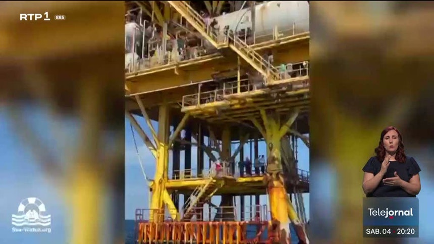 Migrantes resgatados pelo Sea-Watch numa plataforma petroléfera no mar