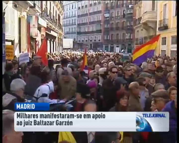 Milhares de pessoas encheram as ruas de Madrid numa manifestação em defesa do Juiz Baltazar Garzón. Políticos de esquerda, artistas e cidadãos anónimos manifestavam-se contra o julgamento do magistrado espanhol. Garzón está a ser julgado por ter iniciado um inquérito aos crimes do franquismo.