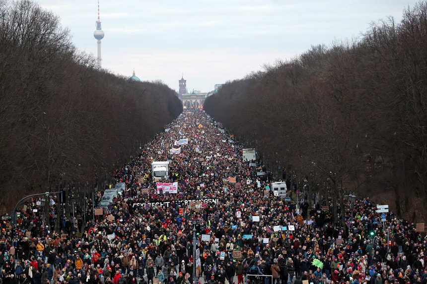 Milhares de pessoas juntaram-se hoje no centro político de Berlim para denunciar a aproximação iniciada esta semana entre a direita e a extrema-direita, a três semanas de eleições legislativas na Alemanha.