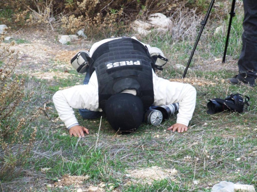 Crédito Foto: José Manuel Rosendo - Palestina, Nablus - Jornalista também reza. Neste caso um camarada muçulmano. Mesmo não havendo Mesquita nem tapete de oração; mesmo com os silvos das balas e as pedras a voarem; mesmo carregado com um pesado colete, um capacete e máscara de gás, e máquinas fotográficas; mesmo quando parece o menos provável, jornalista também reza.