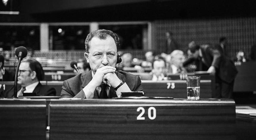 Jacques Delors numa sessão plenária em Estrasburgo enquanto presidente da Comissão Europeia, em março de 1985. Foto: Parlamento Europeu