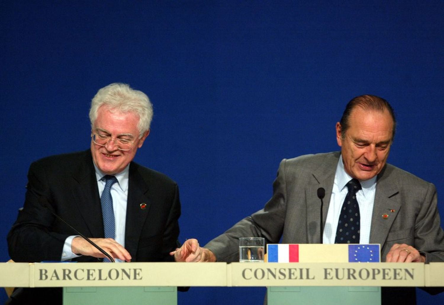 O primeiro-inistro Lionel Jospin e o Presidente Jacques Chirac dão uma conferência de imprensa a 16 de março de 2002, após o Conselho Europeu de Barcelona. Patrick Kovarik / AFP