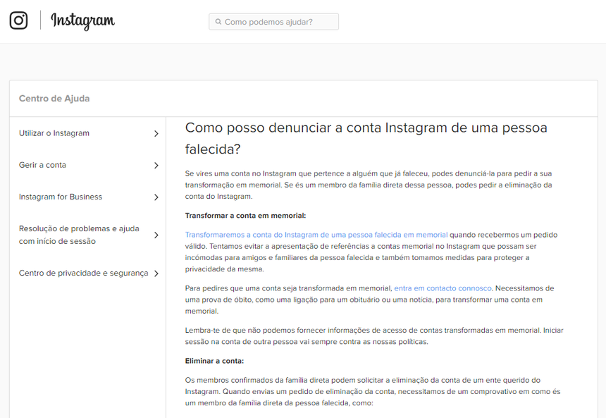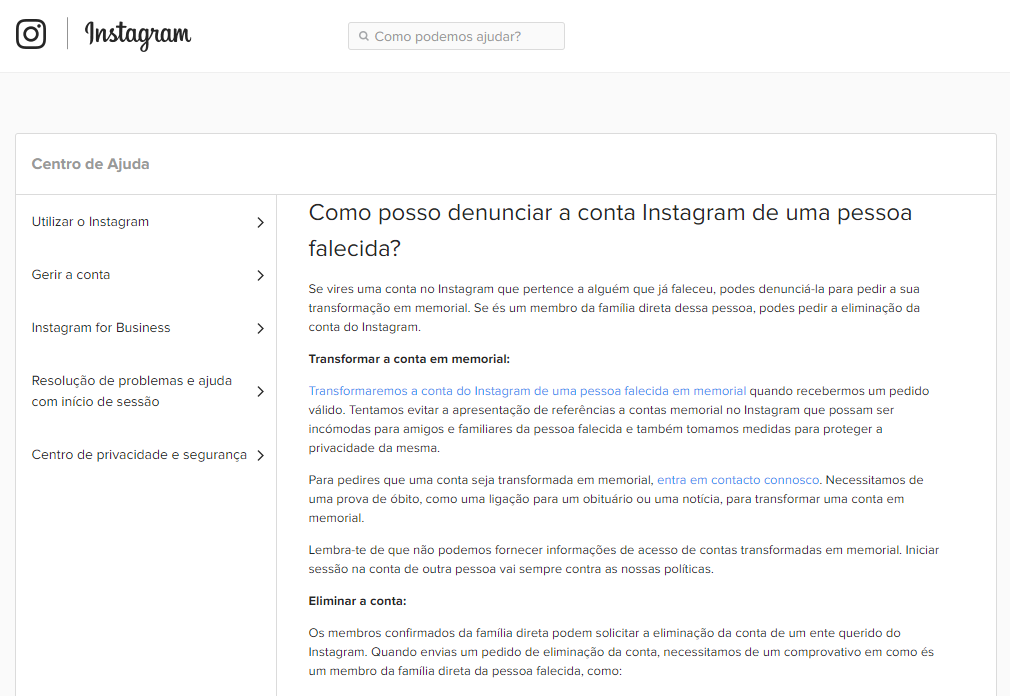 Tal como o Facebook, o Instagram também oferece duas opções. Existem, contudo, algumas diferenças. Qualquer utilizador pode informar a morte de um usuário e transformar o perfil em memorial, sempre através de um comprovativo oficial do óbito. Apenas os parentes diretos podem solicitar a remoção da conta.