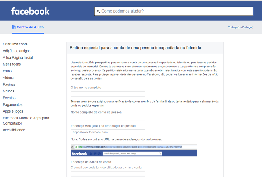 Para apagar a conta na rede social de Mark Zuckerberg é necessário preencher um formulário e enviar um comprovativo do óbito, como o registo de óbito ou uma notícia. Ainda dentro deste procedimento existem duas opções: pode solicitar que o perfil seja removido ou transformado em memorial.