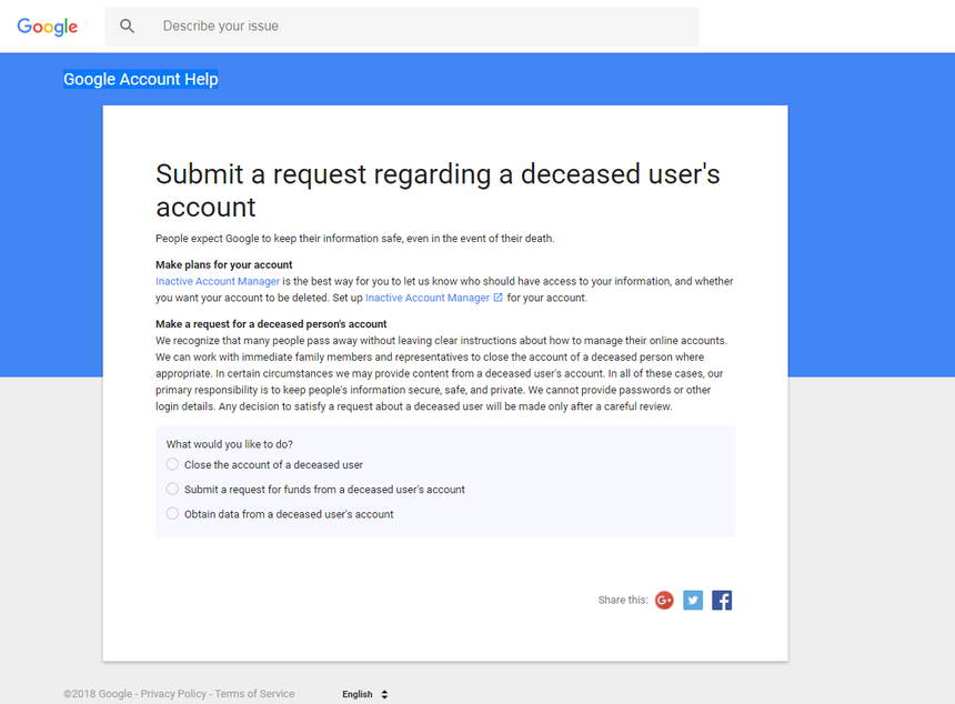 Para isso, é preciso enviar um certificado de óbito. Mas o centro de ajuda da Google avisa que até pode "trabalhar com familiares e representantes imediatos para fechar a conta de uma pessoa falecida quando apropriado. Em determinadas circunstâncias, podemos fornecer conteúdo da conta de um usuário falecido".