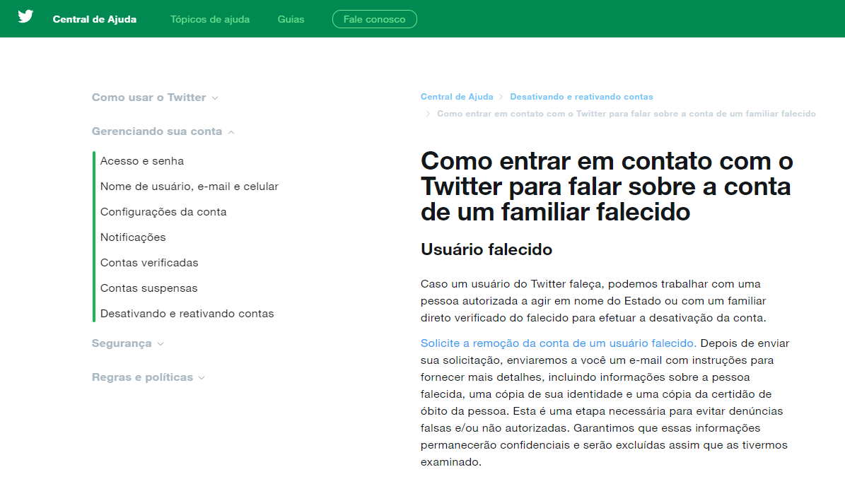 No caso do Twitter, esta rede social, além de exigir uma cópia da certidão de óbito oficial, exige também uma cópia do documento da identidade de quem solicita a remoção do perfil.