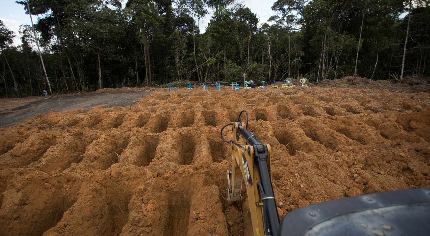 E percebe-se porquê. Esta fotografia mostra uma escavadora a fazer dezenas de valas no cemitério do Parque Taruma, em Manaus. A forma que se arranjou para dar resposta ao aumento substancial de funerais em tão pouco tempo e de forma tão inesperada.