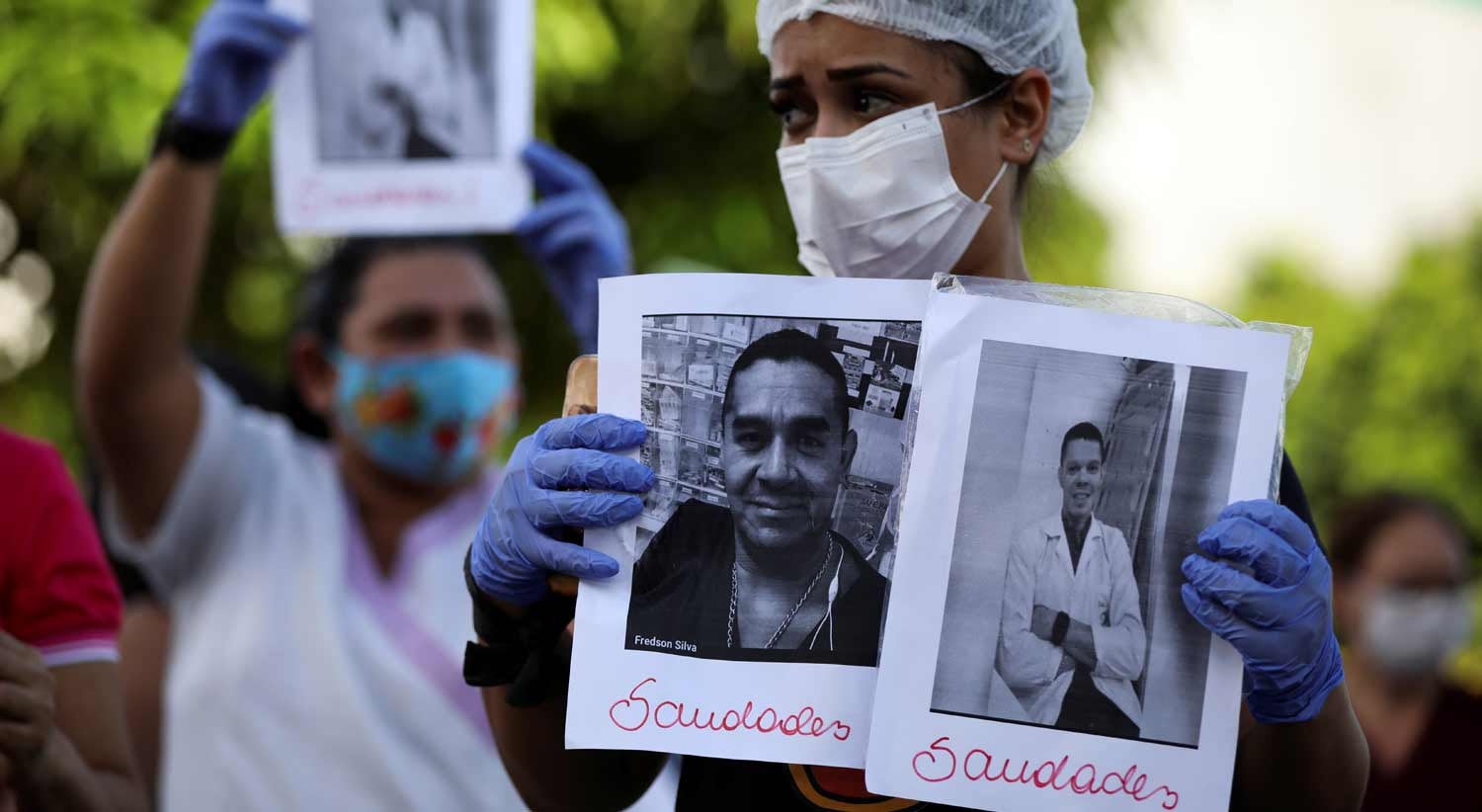 Na imagem seguinte, profissionais de saúde protestam nas ruas pela falta de condições com que têm estado a trabalhar no socorro às pessoas. Levam consigo, nas mãos, fotografias de colegas que morreram depois de terem sido infetados com Covid-19 no hospital onde trabalhavam.