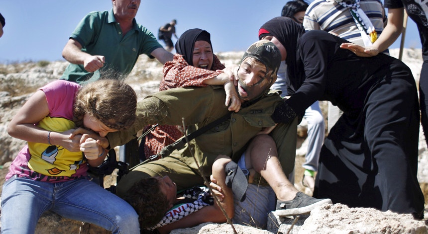 Correu mundo a fotografia de um soldado israelita a deter uma criança palestiniana. Mas a fotografia não diz tudo: um grupo de civis caiu sobre o soldado e obrigou-o a largar a presa.