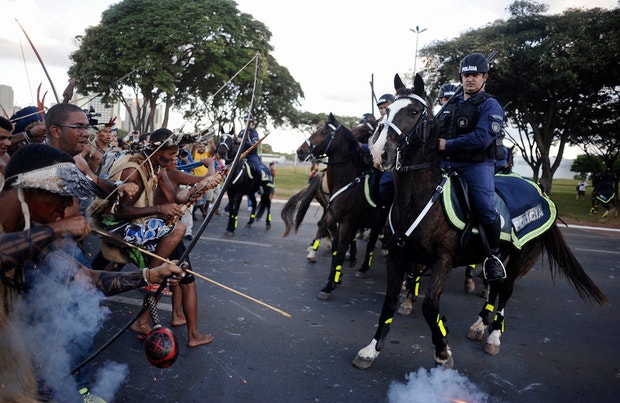 Não parece coisa do século XXI, uma batalha campal entre milhares de índios, com arco e flecha, e um corpo policial, recorrendo principalmente a gás lacrimogéneo. O encontro anual de índios em Brasília inclui sempre algum folclore passadista, mas desta vez inseriu-se no movimento amplo da sociedade brasileira contra o despesismo exorbitante em volta do Mundial de Futebol.