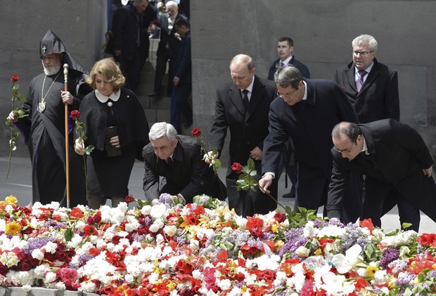 Na homenagem, participaram vários líderes internacionais, nomeadamente o Presidente francês e o seu homólogo russo.Vladimir Putin aproveitou a passagem por Erevan para apelar aos riscos dos nacionalismos e da “russofobia”, numa clara referência ao clima de tensão existente entre o ocidente e Moscovo motivado pelo conflito ucraniano.