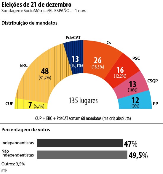 A sondagem da Sociométrica para o El Español divulgada no dia 1 de novembro indica que a Esquerda Republicana de Catalunha deverá conseguir 31,2 por cento dos votos e 48 deputados. O partido de Carles Puigdemont (PdeCat) pode ter 10,1 por cento dos votos e 13 deputados.