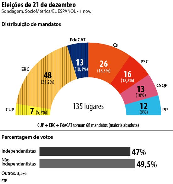 A maioria independentista fica ainda fechada com os sete deputados que a CUP deverá conseguir. A CUP é um partido antissistema e radical que não faz parte do executivo mas que tem aprovado as manobras independentistas no hemiciclo catalão. Ao todo, ERC, PdeCAT e CUP obtêm nesta sondagem 47 por cento dos votos e 68 deputados, número mínimo de uma maioria absoluta no hemiciclo catalão.
