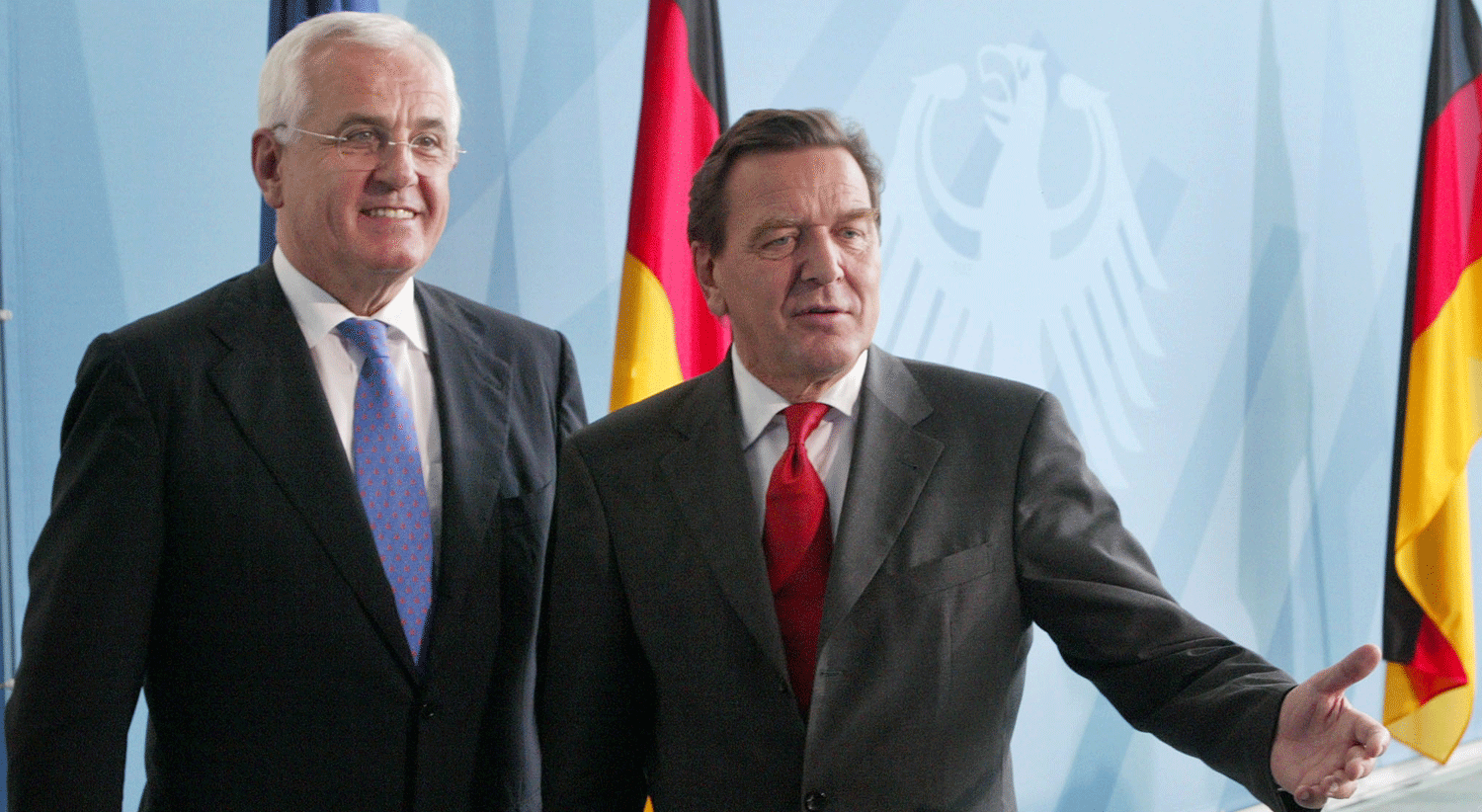 Peter Hartz (esq.), com o chanceler Gerhard Schroeder, em 2002. Foto de Fabrizio Bensch, Reuters