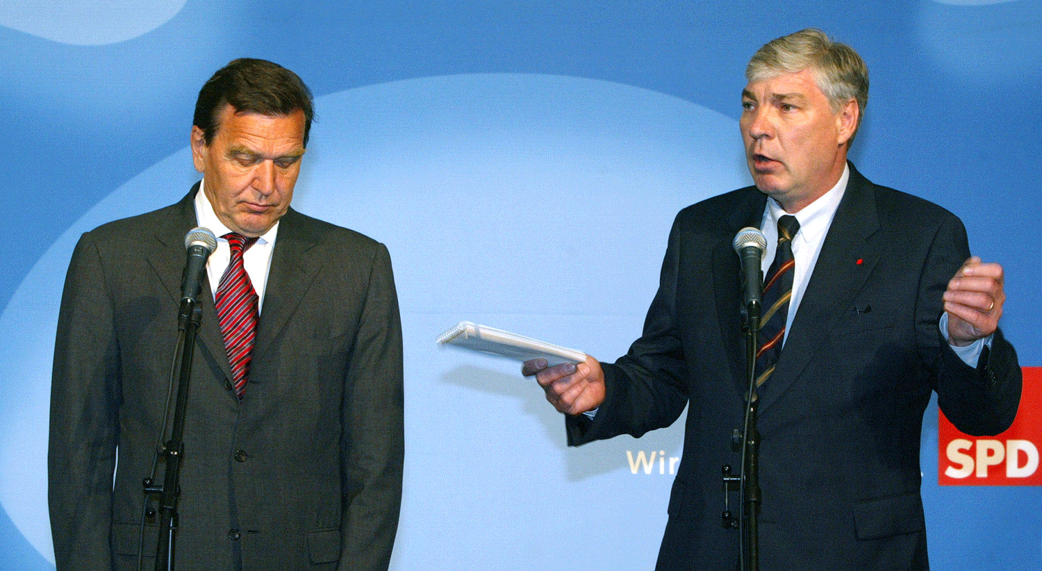 O chanceler Gerhard Schroeder e o presidente da central sindical DGB,Michael Sommer, em 2002, quando se discutia a reforma do mercado de trabalho. Foto de Christian Charisius, Reuters