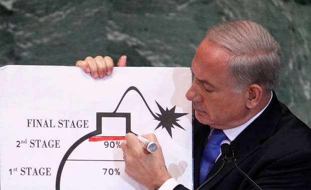 Benjamin Netanyahu lembra que o Irão jurou aniquilar Israel e afirma que, se Teerão foi capaz de desenvolver armas nucleares, esse objetivo estará praticamente conseguido. Sublinhou ainda a ameaça que Teerão coloca à paz mundial.