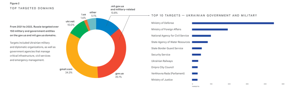 Em 2022, piratas informáticos apoiados pelo Governo russo procuraram, na sua maioria, os utilizadores de produtos informáticos na Ucrânia, mais do que em qualquer outro país. Mas o principal foco incidiu em instituições governamentais ucranianas e entidades militares, bem como em infraestruturas críticas, serviços públicos e públicos, órgãos de comunicação social e espaços de informação.