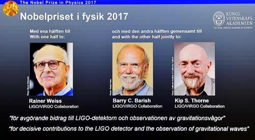 O Prémio Nobel da Física 2017 foi atribuído a três investigadores, metade a Rainer Weiss e a outra metade em conjunto a Barry C.Barish e Kip S.Thorne, "pelas suas contribuições decisivas para o detetor LIGO e a observação das ondas gravitacionais".