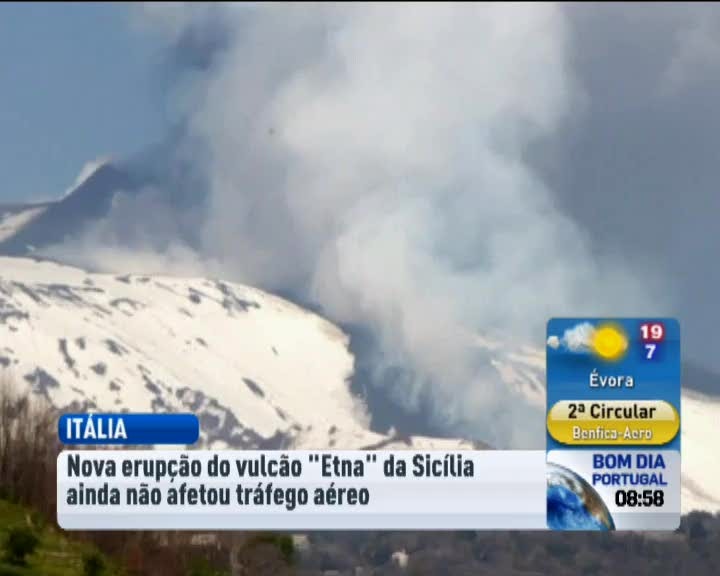 Em Itália, o vulcão Etna entrou em erupção. Situado na Sicília, o Etna é o vulcão mais ativo da Europa. Esta é a terceira erupção nos últimos três meses. Até ao momento, não está a afectar a aviação.