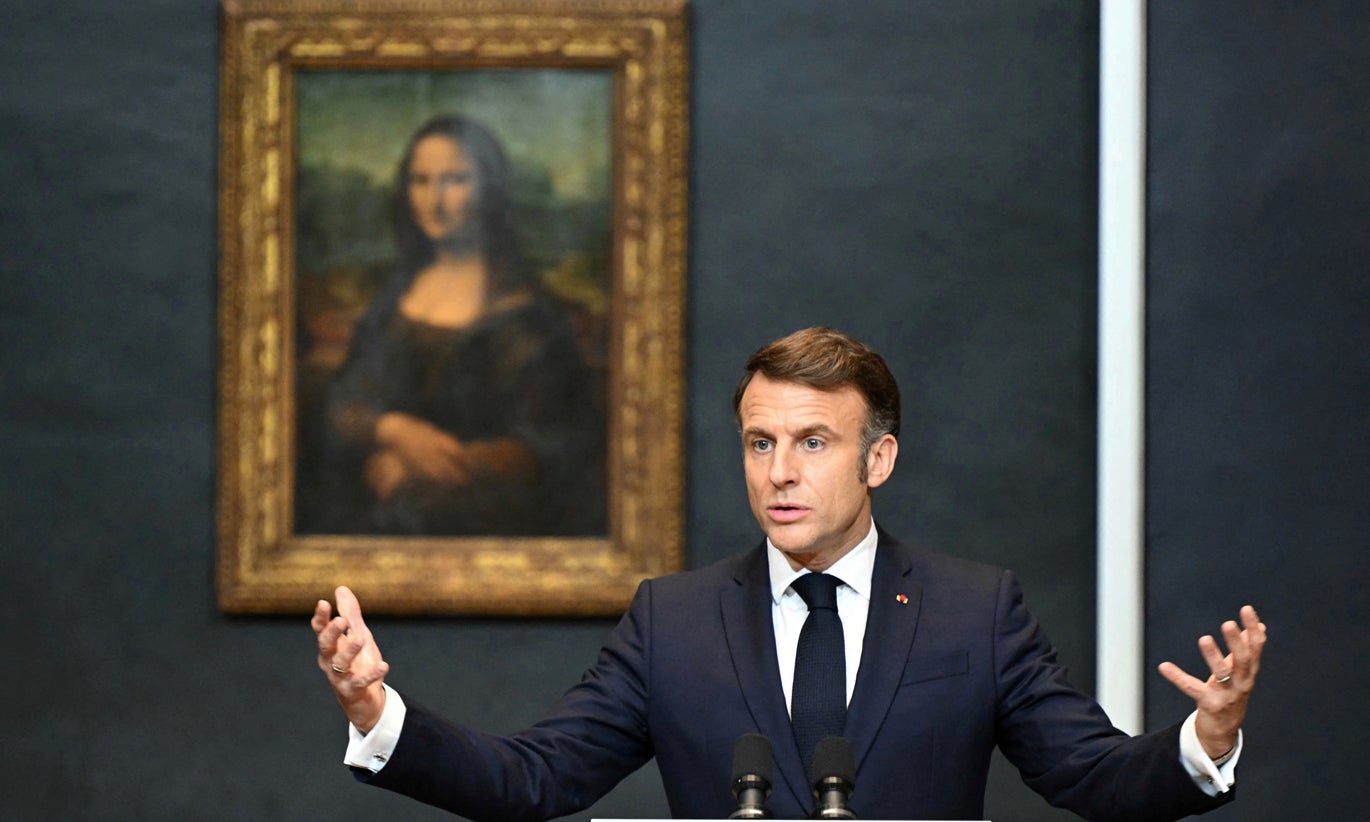 O quadro de Mona Lisa serviu de cenário para o discurso do presidente francês, Emmanuel Macron, que anunciou um plano ambicioso para reabilitar o Museu do Louvre.