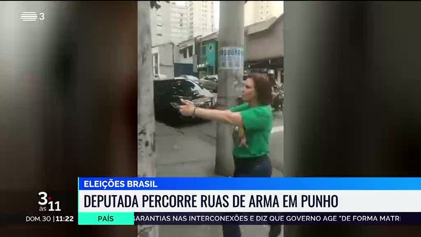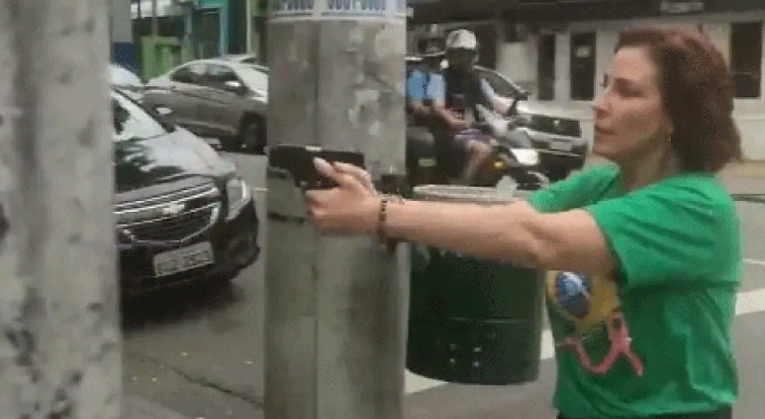 No vídeo mais divulgado, a deputada, apontando a pistola com as duas mãos segue-o até ao estabelecimento.