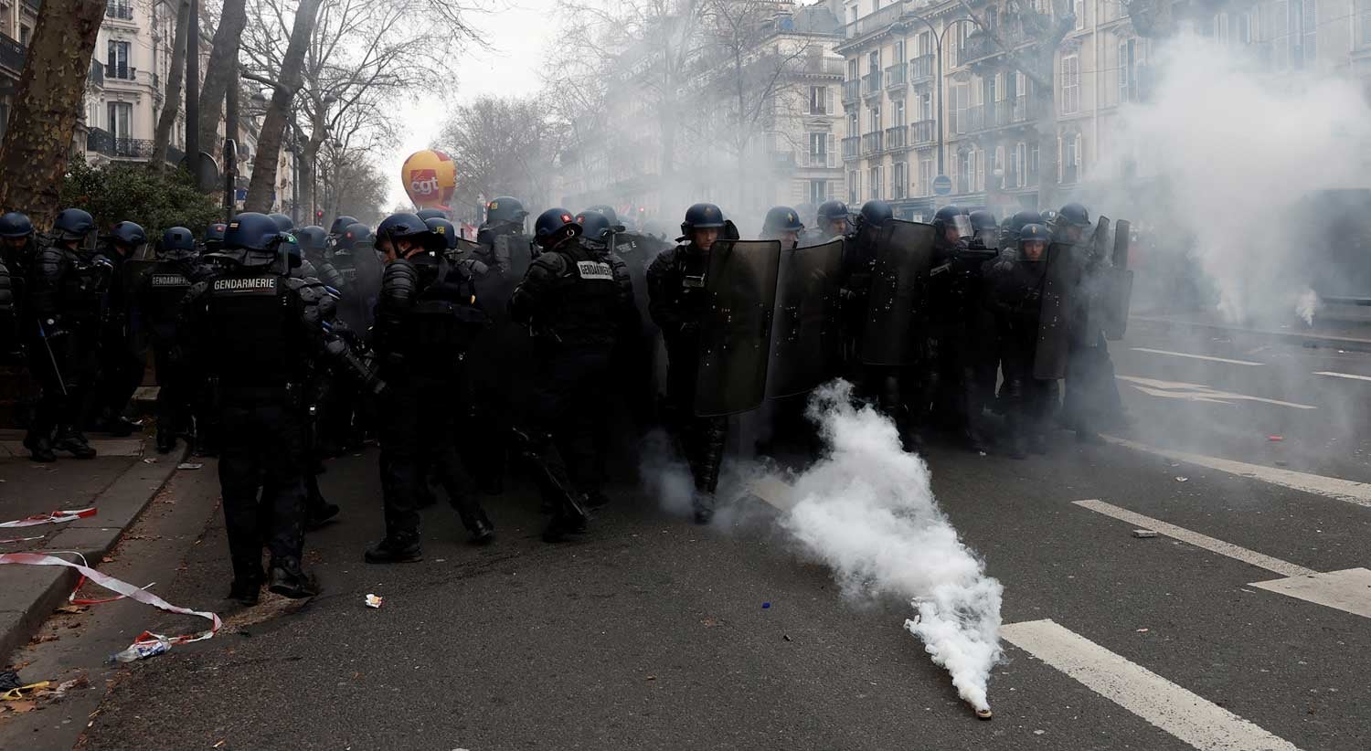 Polícia dispara gás lacrimogéneo nos protestos contra a idade da reforma em Paris, março de 2023. Foto: Benoit Tessier - Reuters